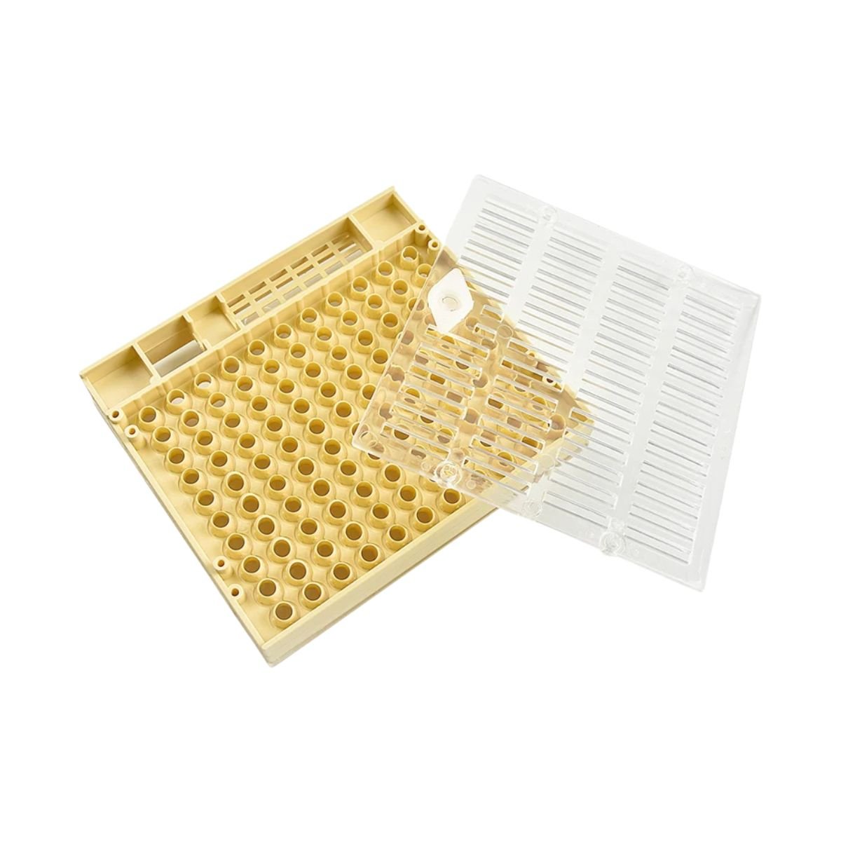 The box is designed for roughly 110 cell cups. In practice, most beekeepers target 60–90 strong cells per cycle to match their mating nuc capacity and avoid overloading their starter/finisher colonies.