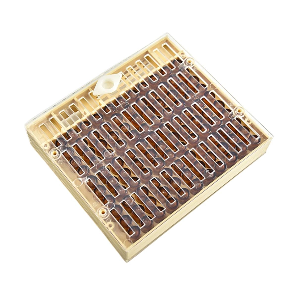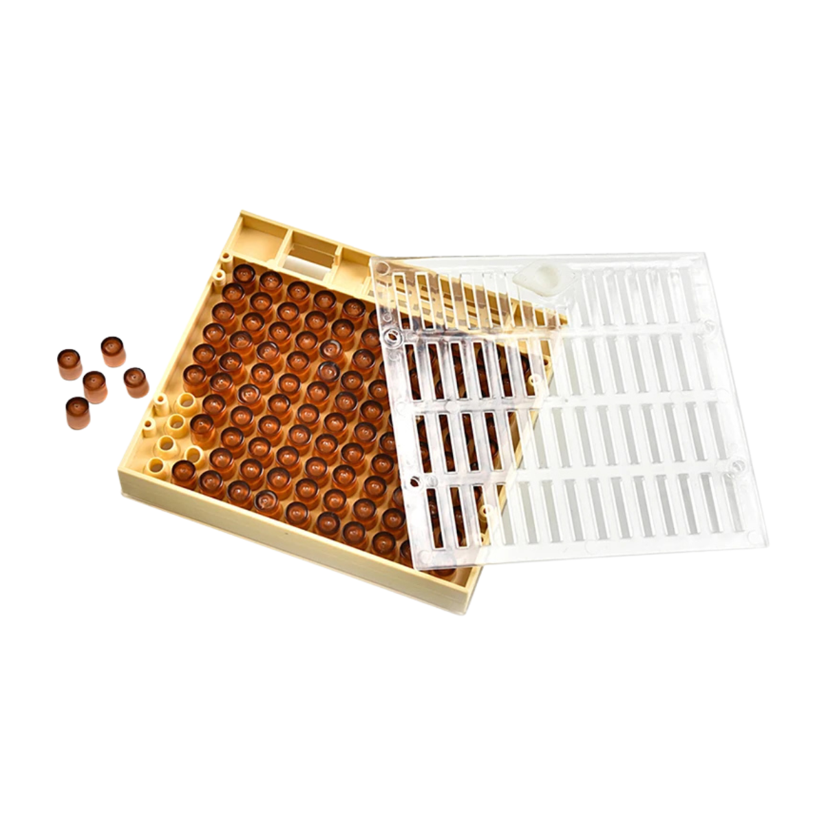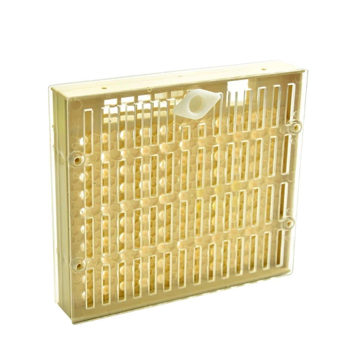 The body is made from rigid, injection-moulded plastic that stands up to daily hive temperatures and the propolis you’ll scrape off season after season. The brown cups act as low-cost consumables: you can replace them in bulk while reusing the main queen breeding box kit for years, which is exactly what commercial yards do to keep costs per queen down.